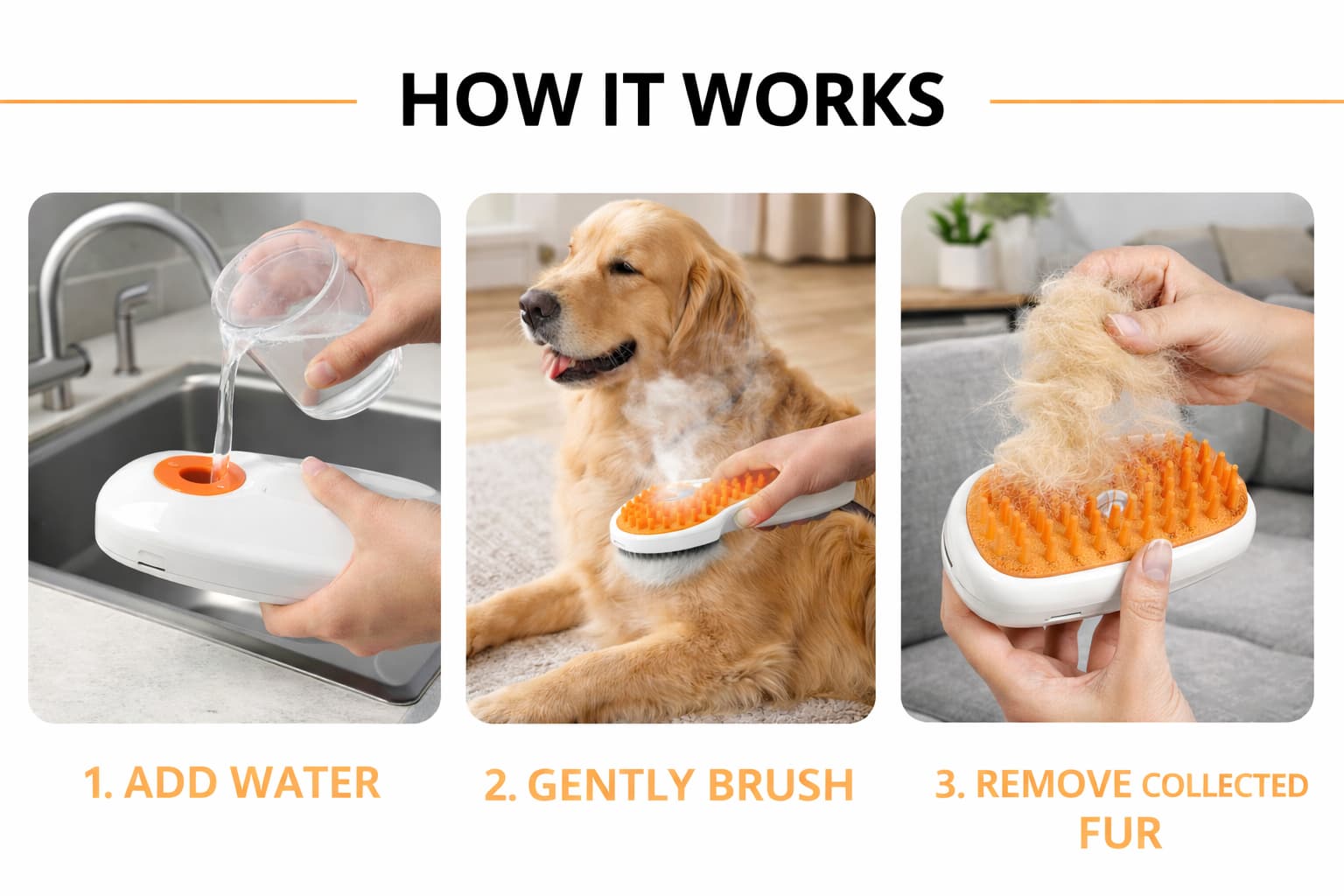 A1: The warm mist opens up the coat and loosens undercoat fur that's ready to shed. This makes it easy for the bristles to catch and remove it before it falls out all over your home.